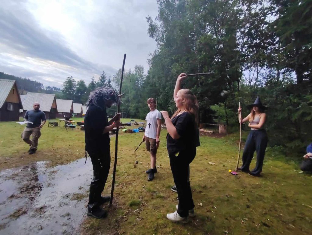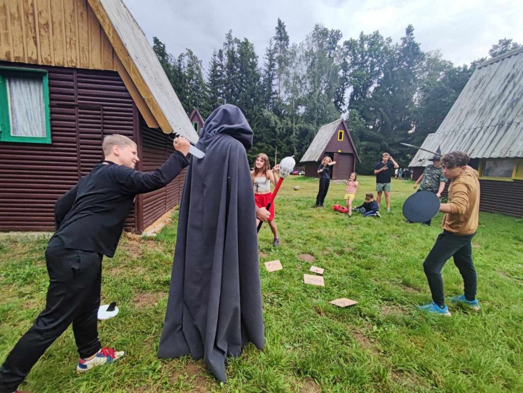 Včerejší diskotéka se opravdu vydařila. Protančili jsme půl noci a celí unavení ovšem plni dojmů a zážitků s ještě hrající hudbou v uších jsme padli do svých postelí. Dnes ráno jsme se připravovali na démona jménem Orkus a jeho společníky. Proběhlo rozsáhlé zdokonalování našich schopností a útrata posledních peněz za všemožná vylepšení. Zbytek času jsme věnovali úklidu a balení. Přeci jen jedeme už zítra ráno za vámi domů a věřte, že se moc těšíme. Ale zatím tu máme ještě plné ruce práce. Po slejváku a bouřce, která zasáhla i nás, nastal čas se zbavit démona a jeho nohsledů. Aktuálně probíhají poslední velké souboje a doufáme, že všichni zvítězíme. Snad je porazíme jednou pro vždy a budeme se moct navrátit do našich domovů.